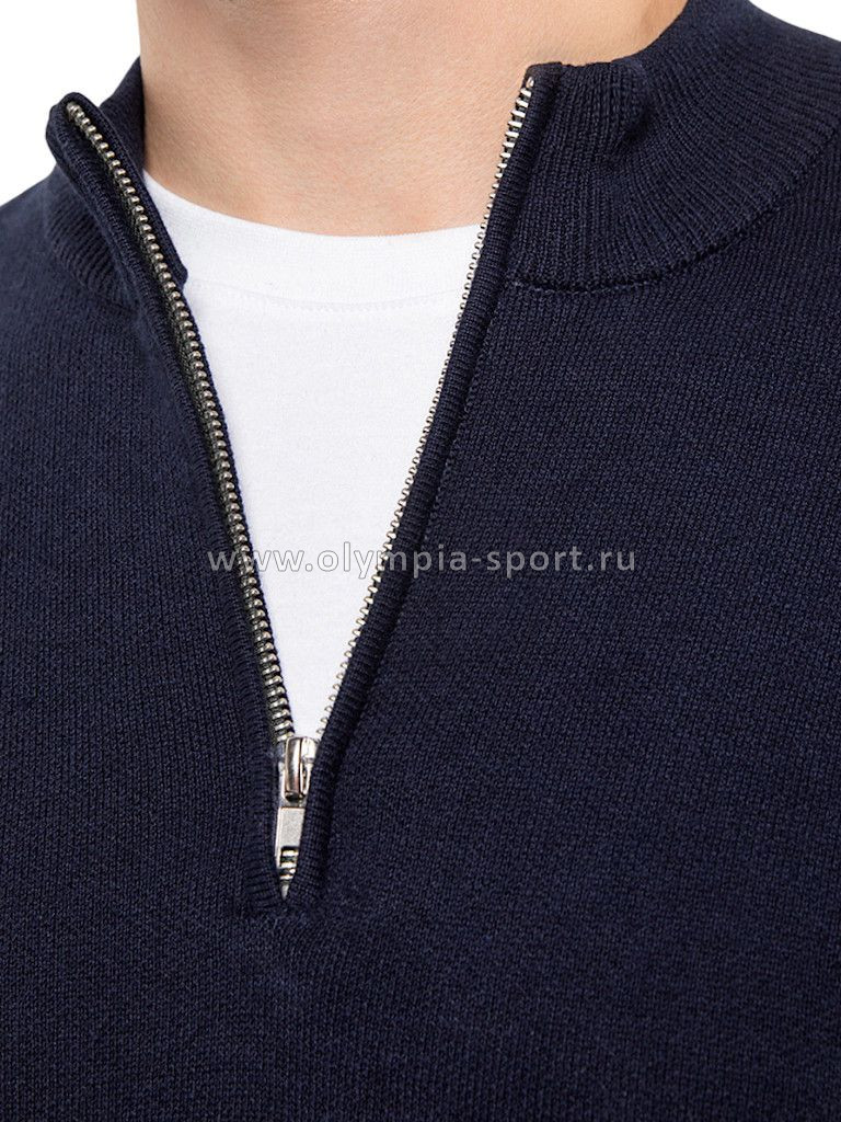 Для изготовления темно-синего джемпера с воротом, застегивающимся на молнию, использовали мягкий трикотаж, связанный из премиального хлопка с добавлением акрила. Двуслойное жаккардовым плетение, вязка с фактурой типа «пике», благодаря чему джемпер имеет среднюю плотность, эластичноть и, при этом, формоустойчивость. Греет за счет иск.шерсти (ПАН) в составе, а премиальный хлопок помогает защитить изделие от скатывания. Такой состав гигроскопичен, греет, но абсолютно не колет.